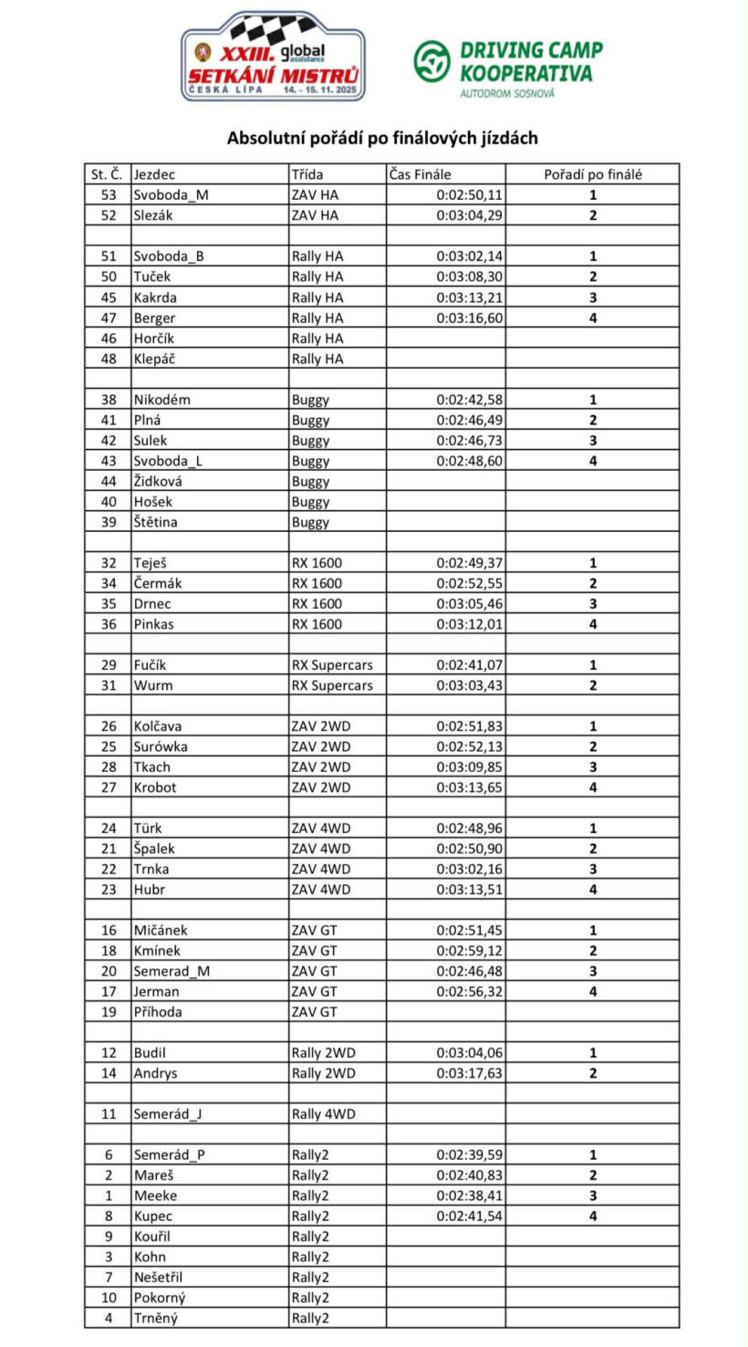 Fanoušci motorismu, soutěžní jezdci z rally, rallycrossu, autokrosu, okruhových závodů i závodů do vrchu se v sobotu 15. listopadu společně rozloučili s uplynulou sezonou na tradičním Global Assistance Setkání mistrů 2025. Autodrom Driving Camp Kooperativa v Sosnové u České Lípy se stal dějištěm jedinečné show, která nabídla nejen souboje mistrů volantu, ale i přátelskou atmosféru, příjemné podzimní počasí bez deště a radost ze setkávání i z rychlosti.