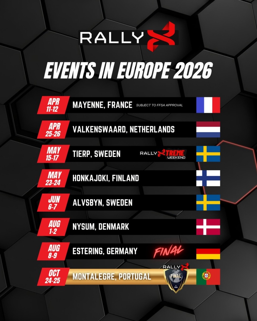 V Evropě nabídne RallyX opět sedm klíčových podniků rozdělených do skupin RallyX North a RallyX South. Každý podnik se pojede ve formátu double-header, tedy se dvěma závodními dny. Program pokryje vše od vrcholných divizí FC2/Open 4WD až po Cross Car Junior pro nejmladší budoucí hvězdy rallycrossu.