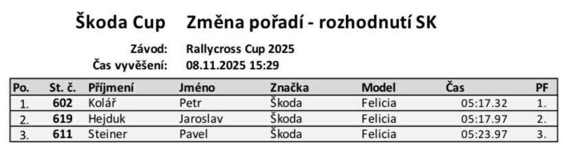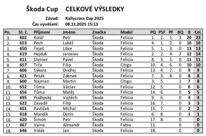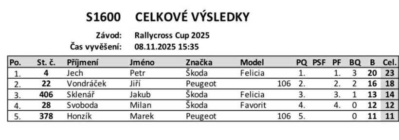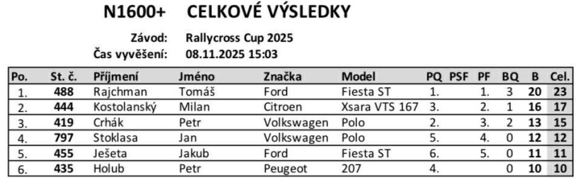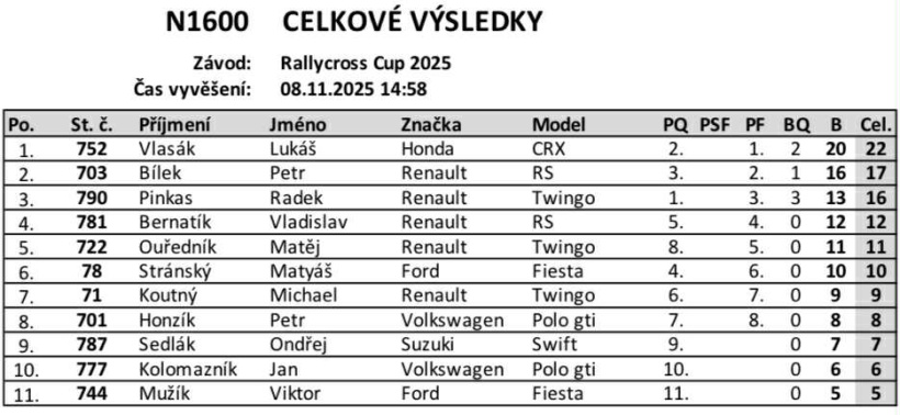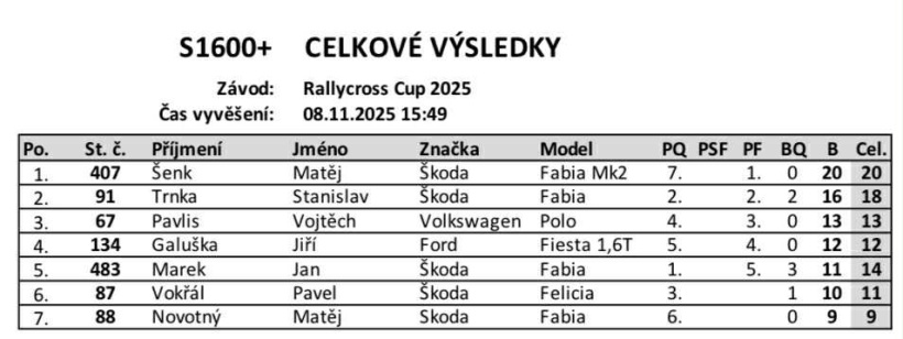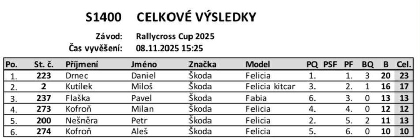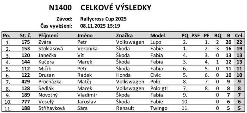 Konečné výsledky volného závodu Rallycross Cupu, který se uskutečnil na nové trati v Milovicích.Rallycross Cup 2025 - Milovice - konečné výsledky