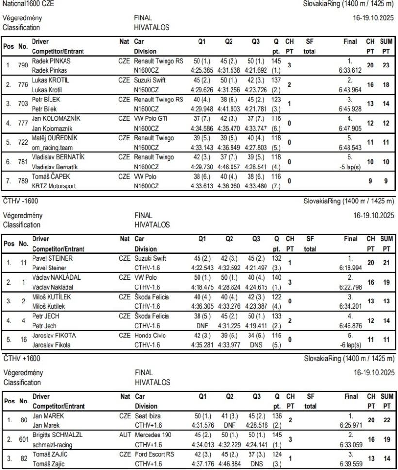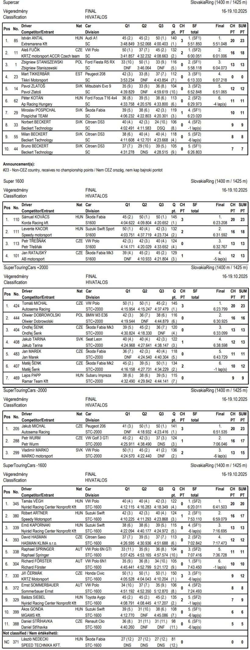 Konečné výsledky devátého letošního závodu Zóny střední Evropy, který se uskutečnil společně se závěrem českého a maďarského šampionátu na Slovakiaringu.